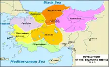 Las regiones administrativas creadas a partir de este sistema estarían en manos de un strategos, un gobernador militar. El objetivo de estos themas era maximizar el potencial militar: Muchos hombres sanos y sus familias se establecieron en los cuatro primeros themas y se les dieron tierras para la agricultura. A cambio de estas tierras, los hombres debían servir al Imperio como soldados leales, y así comenzaron los ejércitos sustentados por los themas del Imperio bizantino que en los siglos venideros demostrarían ser una fuerza de combate confiable aunque no imbatible. No obstante, un ejército autóctono bien entrenado, leal al estado, serviría al Imperio mucho mejor y durante más tiempo que los mercenarios de la época, cuya lealtad era únicamente a la moneda, lo que podría manipularse y volverse en contra el estado mismo, como ya había pasado durante la Caída del Imperio Romano Occidental.[8]