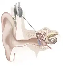 El implante coclear es un producto sanitario implantable activo, de alta tecnología y precisión, encaminado a restablecer la audición de aquellas personas que padezcan una sordera causada por la destrucción de las células ciliadas de la cóclea, estimulando directamente las células ganglionares (nervio auditivo) mediante señales eléctricas encargadas de transmitir la información codificada al cerebro.[2] Hay que recordar que, al ser una prótesis, no cura definitivamente la sordera.