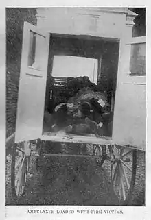 Se produjo un pánico masivo y muchos de los atrapados en el interior intentaron trepar por encima de montones de cadáveres para escapar. Los cadáveres estaban apilados a tres metros de altura alrededor de algunas de las salidas bloqueadas. Las víctimas fueron asfixiadas por el fuego, el humo y los gases o aplastadas por la avalancha de otras personas detrás de ellas. Se estima que 575 personas murieron el día del incendio y al menos 30 más murieron a causa de heridas durante las semanas siguientes. Muchos de los muertos fueron enterrados en los cementerios judíos de Montrose, Calvary, Saint Boniface, Mount Greenwood, Mount Hope, Mount Olivet, Oak Woods, Rosehill, Graceland, Forest Home y Waldheim. [12] [13] [14] [15] [16]
