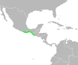 Su área de distribución incluye el sur de México (Oaxaca y Chiapas), Guatemala y el occidente de El Salvador.[1] Su hábitat natural se compone de bosque caducifolio, en la cercanía de ríos y cursos de agua menores,[1] y su rango altitudinal se encuentra entre 300 y 700 m s. n. m..[1]