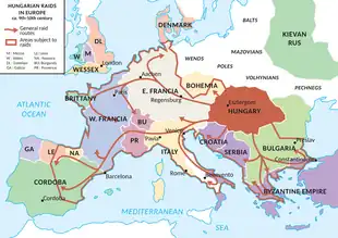 En julio de 942 tuvo lugar una incursión húngara en la península ibérica. Este fue el lugar más occidental que los húngaros atacaron durante el período de su migración a Europa central, aunque en una previa incursión de 924-925, los húngaros saquearon Nimes y es posible que hayan llegado hasta los Pirineos.[1]