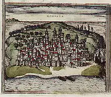 La flota llegó frente a Mombasa el 5 de marzo y encontró a Mir Ali Bey y sus corsarios que habían organizado su defensa dentro de un fuerte a la entrada del puerto.[9] Pronto fueron invadidos por las tropas portuguesas mucho más grandes y Mir Ali huyó a caballo a la ciudad donde se alojaba el Sultán de Mombasa.[9] Los portugueses redujeron completamente la resistencia otomana y se apoderaron de dos de sus galeras cargadas con botín de oro, plata, ámbar, telas y esclavos.[9]