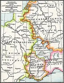 Tras la muerte de Ludovico Pio en 840 y bastantes conflcitos entre sus hijos, estos acordaron, en el año 843, mediante el tratado de Verdun dividirse el Imperio franco en tres reinos. La mayor parte de Renania cayó en el dominio de Lotario I, que se llama Francia Media (y más adelante, en su honor, Lotaringia). Este reino medio se extendía desde el mar del Norte hasta el Mediterráneo, sin que la Francia oriental y la Francia oocidental tuvieron contactos fronterizos. Después de esta división del imperio, estallaron luchas de poder con una estructura similar al de guerras civiles en casi todas las áreas del antiguo imperio , y Renania también se vio afectada. Cuando Lotario I murió en el 855 sin un heredero al trono, las luchas por el poder se intensificaron. En 870, tras el Tratado de Meersen, Renania fue asignada a Francia Oriental. Diez años más tarde, las fronteras se definieron de nuevo con mayor precisión en e tratado de Ribemont.[1] (El mapa de al lado muestra el resultado)