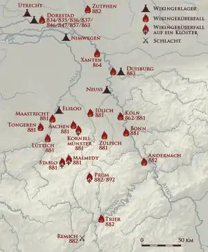 Zutphen en el río IJssel y la cercana Deventer también fueron incendiados durante este alboroto.[Wil. 10] Cerca de Maguncia, los vikingos fueron derrotados por un ejército bajo el mando del conde Enrique de Franconia y del arzobispo de Maguncia, Liutbert (episcopado 863-889);[1] probablemente incendiaron Colonia después.