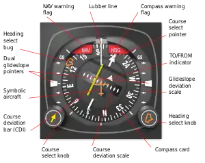 En el HSI, la aeronave está representada por una figura esquemática en el centro del instrumento; la pantalla VOR-ILS se muestra en relación con esta figura. El indicador de rumbo generalmente está vinculado a una brújula remota y el HSI frecuentemente está interconectado con un piloto automático capaz de seguir el error de selección de rumbo y ejecutar una aproximación ILS siguiendo el localizador y la senda de planeo.