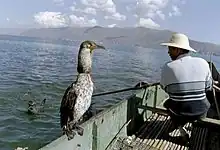 Históricamente la pesca con cormoranes ha sido una técnica de pesca importante en China. Para controlar a las aves los pescadores atan un lazo cerca de la base de la garganta del ave. Esto evita que las aves se traguen los peces más grandes, que se sujetan en la garganta. Cuando un cormorán ha capturado un pez el pescador lo devuelve al barco y hace que el ave escupa el pescado. Los pescadores chinos suelen emplear grandes cormoranes. Aunque la pesca con cormoranes solía ser una industria pesquera de éxito, su uso principal hoy en día es para servir a la industria del turismo. En Guilin, provincia de Guangxi, los cormoranes son famosos por pescar en el río Lijiang, de poca profundidad.