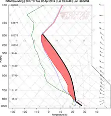 Inestabilidad convectiva, indicada en la región resaltada en rojo ("área positiva"), en un diagrama Skew-T log-P.