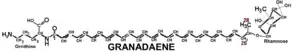 El granadaeno es un polieno (sustancia orgánica que contiene una cadena de dobles enlaces alternando con enlaces simples), no isoprenoide (ornitin ramnododeacaeno).[29]