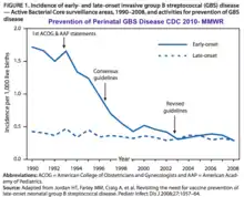 El uso general de la profilaxis antibiótica intraparto (PAI) ha resultado en un descenso en la incidencia de la infección neonatal precoz por EGB en Estados Unidos de más del 85 %, desde un 1,8 ‰ de casos en recién nacidos vivos en los años 1990 hasta un 0,23 ‰ en 2015. [37][45]