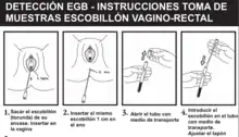 Las muestras tomadas del cuello uterino, del periné o de la zona perianal no son adecuadas.[35][36][37] Las muestras pueden ser tomadas por profesionales de la salud o por la misma embarazada tras adecuada información.[35][36][84][85][86][87]