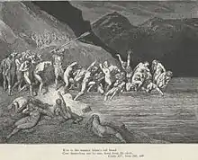 Las almas de los nuevos condenados, cansadas y desnudas, en tanto, después de haber escuchado la increpación de Caronte palidecen de miedo, aprietan los dientes y blasfeman a Dios, sus padres, la especie humana y el lugar, la hora, la estirpe y la semilla que los había generado.