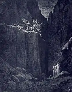 Apenas los dos tocan tierra los diablos llegan a la cima de la colina donde estaban los dos poetas hace poco, pero allí no son peligrosos porque el estar destinados a la quinta fosa por la divina providencia quita a ellos la facultad de salir.