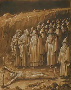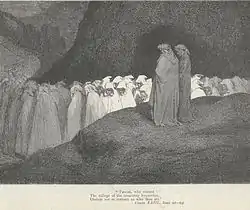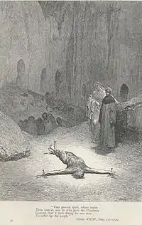 Dante inicia entonces una oración: "¡Oh hermanos, vuestros males..." (no se sabe que tono pensaba darle a su discurso, si despreciativo o mezcla de piedad u otro). Pero es bruscamente interrumpido por una visión, un hombre crucificado (o pegado) al suelo con tres palos, que se distorsiona soplando en la barba cuando descubre que está siendo visto por Dante. Fray Catalano entonces explica que es aquel que aconsejó a los Fariseos sacrificar a un solo hombre para evitarle problemas al pueblo y que ahora está desnudo bajo el pasaje de todos los otros condenados. Es entonces Caifás, el sumo sacerdote de Jerusalén que hizo ajusticiar a Jesús cubriéndose con el pretexto hipócrita de salvar al pueblo sacrificando al fastidioso predicador (excusa que desde un punto de vista laico no se puede considerar hipócrita, sobre todo si se piensa que a los romanos no le gustaban los desórdenes).