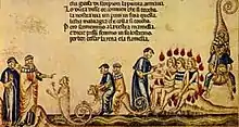 Dante se dirige entonces hacia la tercera categoría de condenados del giro de los violentos contra Dios y la naturaleza. Ya encontró un blasfemador (Capaneo), diversos sodomitas (Brunetto Latini y los tres florentinos), pero todavía ningún usurero, es decir ninguno de los violentos contra la naturaleza y el arte, que, como fue explicado particularmente en el canto XI, no hacen sus ganancias ni con el sudor ni con el ingenio, sino del mismo dinero (en práctica todos los banqueros, según la definición medieval de usura). Ellos están a mitad camino entre las penas de los violentos contra Dios (echados a tierra, bajo la lluvia ardiente), la peor, y la de los sodomitas (en continua carrera bajo la lluvia de llamar), la más leve. Deben de hecho estar sentados, y con sus manos se hacen viento y buscan incesantemente de apagar las llamas apenas caídas. En esta actividad Dante los compara a los perros que se rascan con las patas para calmar las picaduras "o de pulgas o de las moscas o de los tábanos", con un repugnante sentimiento enfatizado con la similitud animalesca. Además Dante nota que ellos tienen una bolsa colgando al cuello con dibujos. Alude muy probablemente a las bolsas que los prestadores y cambiadores llevaban siempre al cuello durante sus negocios y que los distinguía junto con el libro de las cuentas. Sobre estas bolsas están impresos los escudos familiares, que sirven a Dante para nombrar a las familias de usureros, más que a individuos en particular. No indica el nombre, sino solo el escudo porque en aquella época debía ser más que suficiente para reconocer de qué familia se tratase.