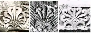 La palmeta de llama, elemento decorativo central del pilar Pataliputra se considera un motivo puramente griego. La primera aparición de "palmetas de llama" se remonta a la akroteria floral independiente del Partenón (447-432 aC),[32] y un poco más tarde en el Templo de Atenea Nike.[33] Las palmetas de llamas se introdujeron en frisos de motivos florales en reemplazo de la palmeta común. Las palmetas de llamas se usan extensamente en los frisos florales de la India, comenzando con los frisos florales en las capitales del pilar de Ashoka, y es probable que se hayan originado con el arte griego o del Cercano Oriente.[34] Una palmetta de llama monumental se puede ver en la parte superior del Portal de Sunga en Bharhut (siglo II a. C.).