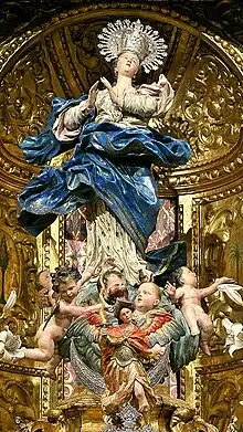La Virgen se apoya en un escabel compuesto por una nube esférica cubierta de querubines; algunos de ellos son de cuerpo entero y de otros solo se aprecia la cabeza, detalle que diferencia a esta Inmaculada de la gran mayoría de imágenes concepcionistas del siglo xvii así como de otras contemporáneas y posteriores, en las que lo habitual es que figure esculpido solo el rostro del querubín. Por su parte, sobre la cabeza luce una corona real de orfebrería enmarcada por una aureola con rayos rematada por dieciséis estrellas en vez de doce, como suele ser habitual para hacer referencia a las doce tribus de Israel, otro elemento diferenciador no solo de las Inmaculadas precedentes y posteriores, sino también de la típología impuesta por Francisco Pacheco,[6] quien sentó las bases representativas de esta advocación mariana con un prototipo[7] inspirado en la descripción dada en el Apocalipsis: «... vestida de sol, con la luna bajo sus pies, y una corona de doce estrellas sobre su cabeza».[8]