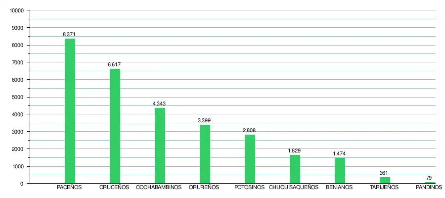 | Gráfica histórica de la inmigración boliviana en Chile por Departamento de Procedencia (Según el Censo de Bolivia de 2012) |