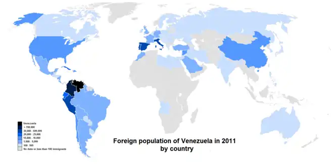La inmigración en Venezuela ha sido de suma relevancia desde la independencia del país en 1810. Los primeros inmigrantes fueron españoles que se asentaron en la costa del actual territorio de Venezuela a principios del siglo XVI. A raíz del auge petrolero a mediados del siglo XX, el país recibió un llamativo influjo inmigrante proveniente en su mayoría de América, Europa, Medio Oriente, y el Este Asiático, influenciando así la cultura, el idioma, las tradiciones y la gastronomía.[1][2]