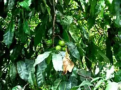 Es un árbol de gran tamaño que puede alcanzar más 30 m de altura, con tronco recto de 1,50 m de diámetro, que crecen con grandes contrafuertes planos. Las hojas son simples, alternas y con flores blancas muy fragantes. El fruto es una drupa redondeada y aplanada de 5-9 cm de largo, de color verde tornando a amarillo o anaranjado cuando está madura y que contiene una almendra. La temporada de cosecha de la fruta tiene lugar en el hemisferio sur alrededor de marzo a mayo y de septiembre a noviembre en el hemisferio norte.