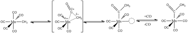 El CO se inserta en un enlace alquilo-metal (M-R) a través de la inserción migratoria. El concepto clave es que tanto el CO como los grupos alquilo son ligandos en el mismo metal. Por ejemplo, la reacción del 13CO (monóxido de carbono marcado isotópicamente) con Mn(CO)5CH3 forman exclusivamente Mn(CO)4(13CO)COCH3. El grupo alquilo migra intramolecularmente a un ligando CO adyacente dentro de la esfera de coordinación del centro de Mn (I). Después de la migración, el metal se une CO libre (ver figura siguiente):[2][3]