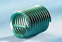 Una inserción helicoidal es una inserción de alambre enrollado en forma de bobina. Se introduce el alambre de forma helicoidal (de acero inoxidable o de bronce fosforoso y de sección en forma de diamante), en un agujero roscado para formar una rosca interna y aparejarla a un tornillo o un perno. Estas inserciones ofrecen un medio conveniente para reparar las roscas desgastadas y también se utilizan para proporcionar roscas más resistentes en materiales blandos, tales como aluminio, fundición a presión de zinc, madera, magnesio, etc. Otro nombre genérico común es: inserción de rosca (STI), y aunque hay muchos nombres se suele utilizar el de la marca registrada "Heli-Coil". Entre otras aplicaciones una importante es la reparación de la culata de un motor después de torcer involuntariamente la bujía estropeando la rosca. Para ello existen kits con rosca compatible. La pieza radial recta de la foto es la llave del conductora, que se utiliza para atornillar la bobina en su sitio, haciéndola girar con unos alicates y se descarta después de la instalación.