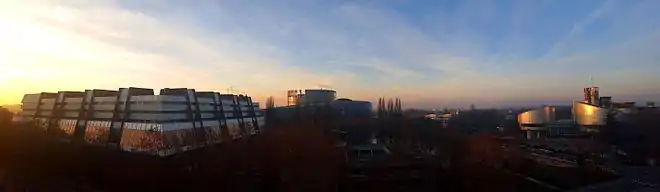 Entre 1980 y 1991, el Parlamento Europeo construyó tres edificios de oficinas en la orilla derecha del Ill. Están conectadas con el Palacio de Europa por una pasarela.