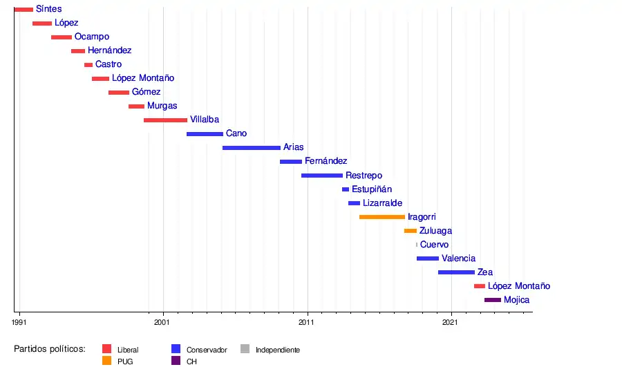 | 25 de agosto de 1999 – 7 de agosto de 2002 | Rodrigo Villalba Mosquera | ![]() | Partido Liberal | |