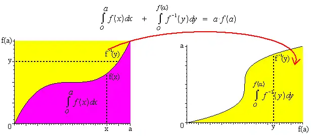 El área morada es la integral de f, el área amarilla es la de f -1, y la suma es el rectángulo cuyos costados miden a y f(a) (valores algebraicos). Se pasa de la primera curva, la de f, a la segunda, la de f -1 aplicando la simetría axial alrededor de la diagonal y = x.