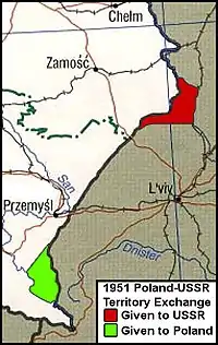 El intercambio territorial polaco-soviético o el tratado de ajuste fronterizo polaco-soviético de 1951 fue un ajuste fronterizo firmado en Moscú entre la República Popular de Polonia y la Unión Soviética en torno a 480 km² de tierra a lo largo de su frontera mutua. El intercambio se hizo con el beneficio económico decisivo de la Unión Soviética debido a los ricos depósitos de carbón abandonados por Polonia; estos depósitos fueron descubiertos mucho antes de la Segunda Guerra Mundial.[1][2] Dentro de los ocho años siguientes al acuerdo, los soviéticos construyeron cuatro grandes minas de carbón con una capacidad total de quince millones de toneladas anuales.[3]