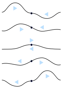 Sucesión (de arriba hacia abajo) de una Interferencia destructiva. Las flechas representan la dirección de las crestas y valles, mientras los puntos representan el nodo que se produce.