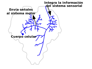 La neurona también llamada neurona de asociación, tiene la función de analizar la información sensorial y almacenar parte de ella. También actúa en los actos reflejos, transformando un estímulo en respuesta a nivel de la médula espinal. Se encuentran situadas entre las neuronas sensitivas y motoras y se localizan en los centros nerviosos superiores.