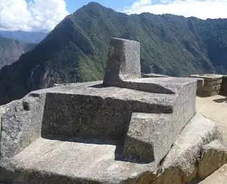 Una intihuatana es una escultura monolítica labrada en piedra granítica, de 1 a 2 metros de altura y 2 metros de diámetro. Su forma parte de una base con distintos niveles y en la parte superior se eleva un saliente de aspecto cúbico donde cuatro de sus caras indican a un punto cardinal: norte, este, sur y oeste. Posiblemente fue utilizada como un reloj de sol,[12] ya que se alinea con la posición del sol durante el solsticio de invierno.[13] El Sapa Inca creía que la piedra mantenía al sol en su lugar a lo largo de su camino anual en el cielo. Al mediodía en los equinoccios, el sol se encuentra casi sobre el pilar, sin proyectar sombra alguna. El 21 de junio, la piedra proyecta la sombra más larga en su lado sur y el 21 de diciembre, una sombra mucho más corta en su lado norte. Se dice que la base tiene "la forma de un mapa del Imperio Inca", pero la mayoría de los arqueólogos no están de acuerdo, observando que la base es achaparrada y rechoncha mientras que el Tawantinsuyu es largo y delgado.[14][15] Pedro Sueldo Nava describe el hito como "quizás uno de los lugares más bellos y enigmáticos que se encuentran en Machu Picchu".