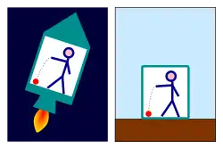 Así como puede lograrse que la mayoría de los efectos de la gravedad desaparezcan haciendo observaciones en caída libre, también se pueden producir observando los objetos en un marco de referencia acelerado. Por ejemplo, un observador encerrado en una habitación no puede saber cuál de estas dos afirmaciones es la correcta: