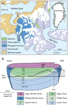 La intrusión de Skaergaard es una intrusión estratificada en Groenlandia Oriental.[1] Fue descubierta por Lawrence Wager[2] en 1931 durante la Expedición de la Ruta Ártica Aeréa Británica liderada por Gino Watkins. Ha sido importante para el desarrollo de varios conceptos clave en la petrología ígnea, incluyendo la diferenciación magmática, la cristalización fraccionada[3][4] y la formación de estratos en rocas ígneas.[5][6] La intrusión de Skaergaard se formó cuando magma tholeiitico fue emplazado hace más o menos 55 millones de años,[7] durante la apertura inicial del Atlántico Norte.