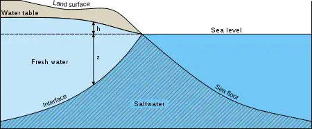El espesor de la zona saturada de agua dulce, por encima del nivel del mar, se representa con mientras que, con se representa el espesor del agua dulce por debajo del nivel del mar.