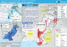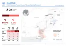 Las fuertes lluvias monzónicas y las inundaciones vienen afectando a 33 millones de personas en Pakistán desde mediados de junio,[4][9][10] habiendo destruido 564 831 casas y dañado otras 1 147 683.[4] Sind y Baluchistán son las dos provincias más afectadas en términos de impacto humano e infraestructural. Murieron 753187 cabezas de ganado, la mayoría en la provincia de Baluchistán,[4] mientras que la destrucción de 6579 km (4088 mi) de carreteras y de 246 puentes[4] impide el acceso a las zonas afectadas por las inundaciones.[21] Más de 17 560 escuelas resultaron dañadas o destruidas.[21] A pedido de la Autoridad Provincial de Gestión de Desastres de Baluchistán (PDMA), se llevó a cabo una evaluación multisectorial rápida de las necesidades en 10 distritos de Baluchistán para identificar las prioridades y diferencias entre sectores. Hay varios socios humanitarios que están apoyando la respuesta gubernamental en las áreas afectadas, redirigiendo los recursos existentes hacia las necesidades más urgentes mientras trabajan para ampliar el alcance de la respuesta.[cita requerida].