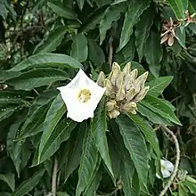 Se trata de un arbusto o, más frecuentemente, un árbol de hasta 8 m de altura, de madera blanda. El tronco es gris amarillento, liso en la madurez, de hasta 40 cm de diámetro y muy ramificado. Las hojas de margen liso son oblongo-elípticas de ápice agudo o acuminado, de 8 a 17 cm de largo y 3 a 5 cm de ancho; son glabras en el haz y con pubescencia sobre las nervaduras en el envés. Las flores solitarias se presentan en las axilas de las hojas o bien están dispuestas en panículas terminales. Su corola blanca es infundibuliforme, de unos 7 cm de diámetro y longitud. El fruto es una cápsula ovoide, de 1.8 a 2.5 cm de longitud, con 4 semillas, elipsoides, de 10 a 12 mm de largo y con pelos blancos largos y puntiagudos.[1][2]