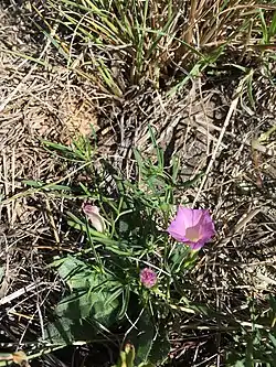 Hierba postrada o decumbente, perenne; tallo más o menos lignescente en la base, ramificado, glabro; hoja palmatisecta, segmentos 5 a 9, lineares, de (0.3)0.5 a 1.6(2) cm de largo, de 0.2 a 0.5 cm de ancho, los exteriores más cortos que los interiores, ápices obtusos; flores solitarias; Sépalos subiguales, de 3 a 7 mm de largo, los exteriores ligeramente más cortos que los interiores, elípticos, los interiores lanceolados, membranáceos, glabros; corola con forma de embudo (infundibuliforme), de 1.8 a 2.6 cm de largo, de color rojo vino a purpúrea, tubo rosado; el fruto es una cápsula globosa a subglobosa, de 4 a 6 mm de diámetro, bilocular, con 4 semillas de 3 a 5 mm de largo, más o menos puberulentas.[1]