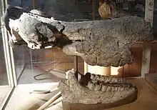 La mandíbula inferior era estrecha pero robusta y tenía una longitud de aproximadamente 54 cm. Tuvo una gruesa sínfisis que llegó a la mitad del tercer premolar. Carecían de dientes frontales (incisivos y caninos) y los molares, muy adelantados, comprendían tres premolares y tres molares, tanto superiores como inferiores, de modo que la fórmula dentaria para animales adultos era la siguiente: .