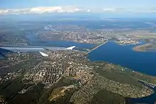 ![]() En el sentido de las agujas del reloj, desde la esquina superior derecha: Torre del Reloj, Galería de Pinturas, panorama de Irkutsk desde la presa, Museo de Costumbres Locales, Cine Khudozhestvenny, Iglesia de Kazán