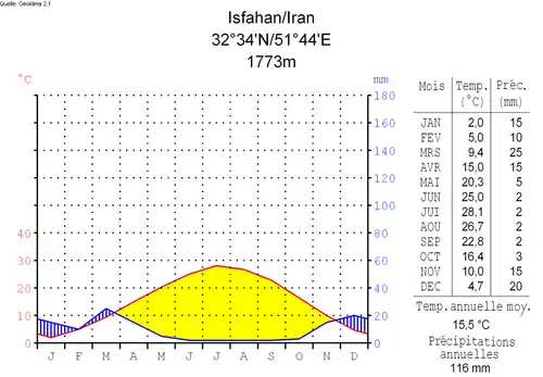 El clima de Isfahán y la región circundante es semidesértico con un período de sequía de abril a noviembre. La precipitación media anual es de 130 milímetros, la mayoría de las cuales se producen durante los meses de invierno, entre diciembre y abril, en forma de nieve o lluvia. Durante el verano, no hay precipitaciones. La diferencia entre verano e invierno en cuanto a temperaturas es notable, con un promedio de 30 °C en julio y 3 °C en enero. El potencial anual evapotranspiración es 1500 milímetros por año, haciendo imposible cualquier forma de agricultura sin irrigación.[9]