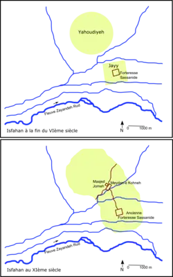 La información sobre la ciudad de Isfahán en el período preislámico es proporcionada por historiadores árabes y geógrafos del período islámico temprano.[15] Isfahán consistía entonces en dos sitios casi distantes: «Jay» o «Jayy», la sede de los gobernadores sasánidas, y «Yahoudiyeh» (o «Yahudiyeh»), la ciudad judía. Mientras Jayy servía como centro administrativo y militar, Yahudiyeh albergaba los hogares de la gente.[16] Un grupo de prósperas aldeas alrededor de Yahudiyeh en el oasis de la zona (Yaran, Khushiinan, Karan, Televajgun, Khujan, Sunbulan, Ashicaban y Felfelan). Un segundo «satélite» estaba situado a cuatro kilómetros de la primera con dos aldeas llamadas Juzdan y Lublan.