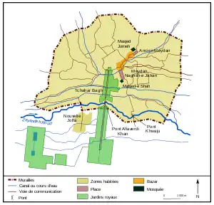 Como urbanista "riguroso y autoritario[24] Abbás comienza desplazando por la fuerza a varios miles de armenios de Yolfa (Noroeste de Irán), donde eran hostigados por los turcos otomanos, y los asentaron en un barrio al otro lado del río Zayandeh, permitiéndoles construir sus iglesias y con la intención de utilizar sus talentos como comerciantes.[23] Él mismo planeó el planeamiento urbano de Isfahán, tal vez inspirado en la villa de Herat, entonces todavía centro cultural de Irán (hoy en Afganistán). En 1590,[27] Shah Abbás comenzó las obras de la plaza Naghsh-e Yahan ("vista del mundo"),[28] al este de un jardín selyúcida del mismo nombre, destinado a hacerse cargo de las funciones principales de la Plaza Vieja:[29][23] la Puerta Qeysarieh conduce al bazar,[27] que se amplía para alcanzar el extremo norte del cuadrado,[23] que mide 512 metros de longitud por 159 metros de anchura wide[30] y estará rodeada al oeste por un complejo palaciego en el sitio del jardín selyúcida, al que se accede por la puerta Ali Qapou ("la puerta alta"), terminada en 1615 antes de las obras de 1644, al sur por la mezquita del Shah (cuya construcción comenzó en 1611-1612) y al este por la Mezquita del jeque Lotf Allah (completada en 1618-1619).[29] Alrededor de la plaza se construyen tiendas en dos plantas en todo el espacio dejado libre entre los edificios, rodeado por un paso cubierto como en el bazar.[16] El ala occidental está dedicada a almacenes que suministran a los almacenes reales (mercancías de lujo, oro y joyas), y el ala sur a libreros, encuadernadores y comerciantes de cuero; los artesanos se concentran en el ala este y el ala norte alberga lugares públicos (café y hoteles).[16]