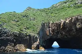 ![]() El arco de roca "El Túnel" en la isla de Aorangaia desde el oeste | ||