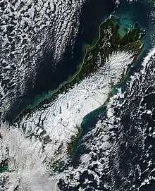 El clima de la Isla del Sur es mayoritariamente templado. La temperatura media de la Isla del Sur es de 8 grados Celsius (46,4 °F).[12] Enero y febrero son los meses más cálidos mientras que julio es el más frío. Las máximas y mínimas históricas son 42,4 °C en Rangiora, Canterbury y -21,6 °C en Ophir, Otago.[13]