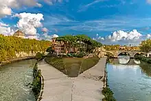 A la isla se puede acceder por los antiguos Puente Fabricio y Puente Cestio. Desde el extremo meridional se puede ver también el Puente Emilio, también conocido como el Puente Roto.