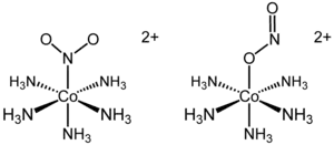 El primer ejemplo reportado de isomería de enlace tiene la fórmula [Co(NH3)5(NO2)]Cl2. El complejo catiónico de cobalto existe en dos isómeros de enlace separables.. En el isómero color amarillo, el ligante nitro está unido a través del nitrógeno. En el isómero de enlace rojo, el nitrito está unido a través de un átomo de oxígeno. El isómero enlazado por el oxígeno suele ser escrito como [Co(NH3)5(ONO)]2+. Aunque la existencia de los isómeros se conocía desde finales del siglo XVIII, solo en 1907 se explicó la diferencia estructural.[1] Se mostró posteriormente que el isómero rojo se convertía en el isómero amarillo por irradiación UV. En este ejemplo particular, la formación del isómero nitro (Co-NO2) a partir del isómero nitrito (Co-ONO) tiene lugar a través del reordenamiento de la estructura molecular. En consecuencia, no se rompen enlaces durante la isomerización.