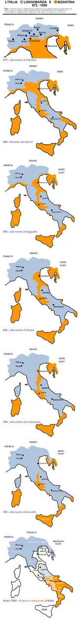 En la Edad Media, después de la llegada de los lombardos a la península itálica, la expresión Italia bizantina se refiere, desde un punto de vista territorial (que fluctuó a lo largo de los acontecimientos, las conquistas y reconquistas de cada uno), las regiones quedaron adscritas al Imperio romano de Oriente o devuelto a su posesión (las últimas posesiones bizantinas en Italia desaparecieron en el siglo XII con las conquistas de Roger II de Sicilia):[2][3]