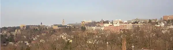 - La Universidad Cornell, situada sobre East Hill ("colina del Este") y miembro de la Liga de la hiedra