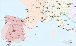 Dentro de la península ibérica se incluyen varios: uno que recorre la costa mediterránea, continúa por el interior hasta Sevilla y llega a los puertos donde se embarcaba para el norte africano (rutas n.º 13, 14 y 15); el clásico Camino de Santiago —incluyendo el desvío por Oviedo— (ruta n.º 23) así como otro para conectar este —desde Astorga— con Sevilla (ruta n.º 25).